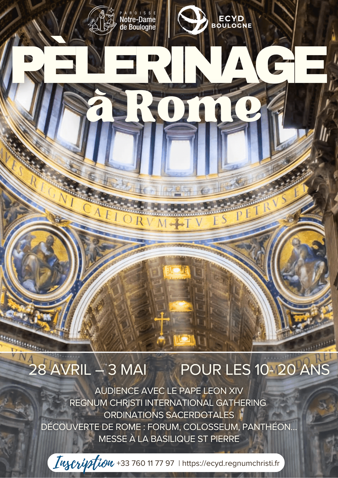Pèlerinage à Rome – 28 avril au 3 mai 2025 Pour les jeunes de 10 à 20 ans Vivez une expérience unique alliant foi, culture et amitié : audience avec le Pape, Regnum Christi International Gathering, ordinations sacerdotales, découverte de Rome (Forum, Colisée, Panthéon…) et messe à la Basilique Saint-Pierre.